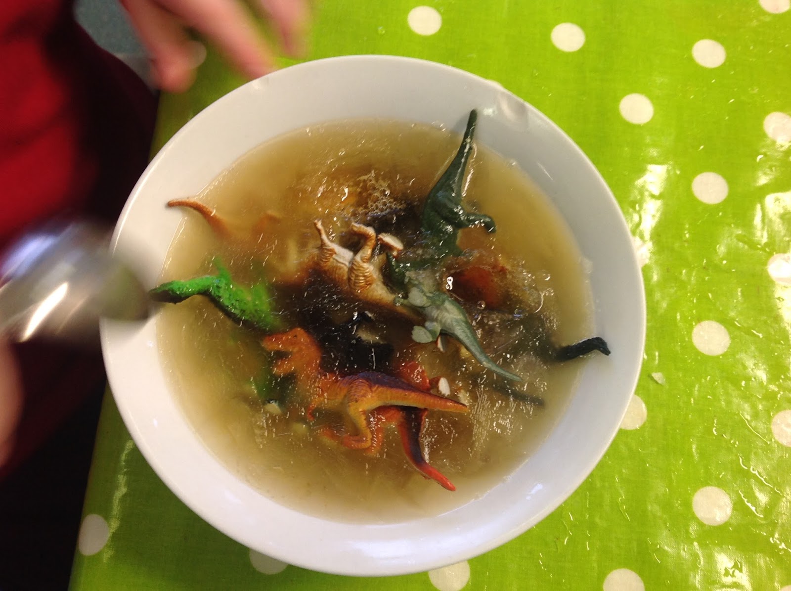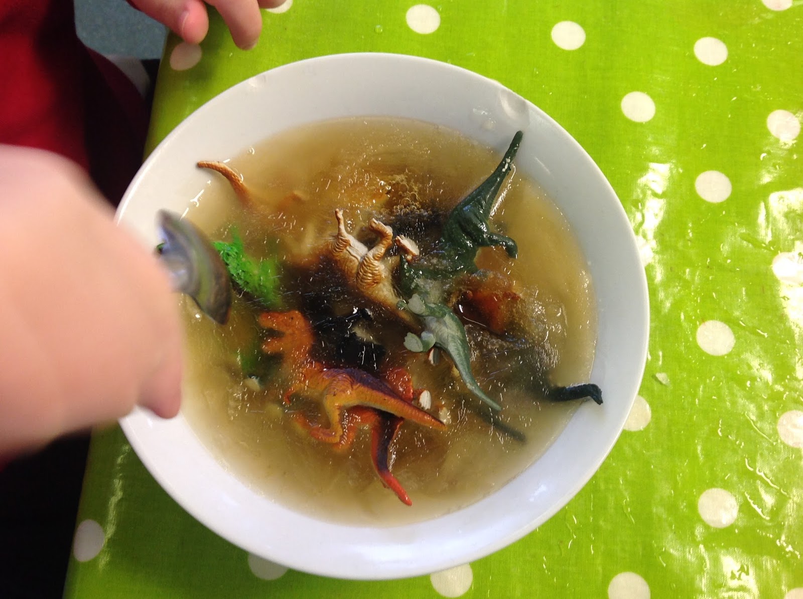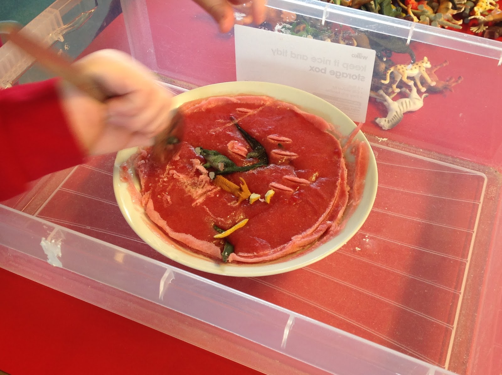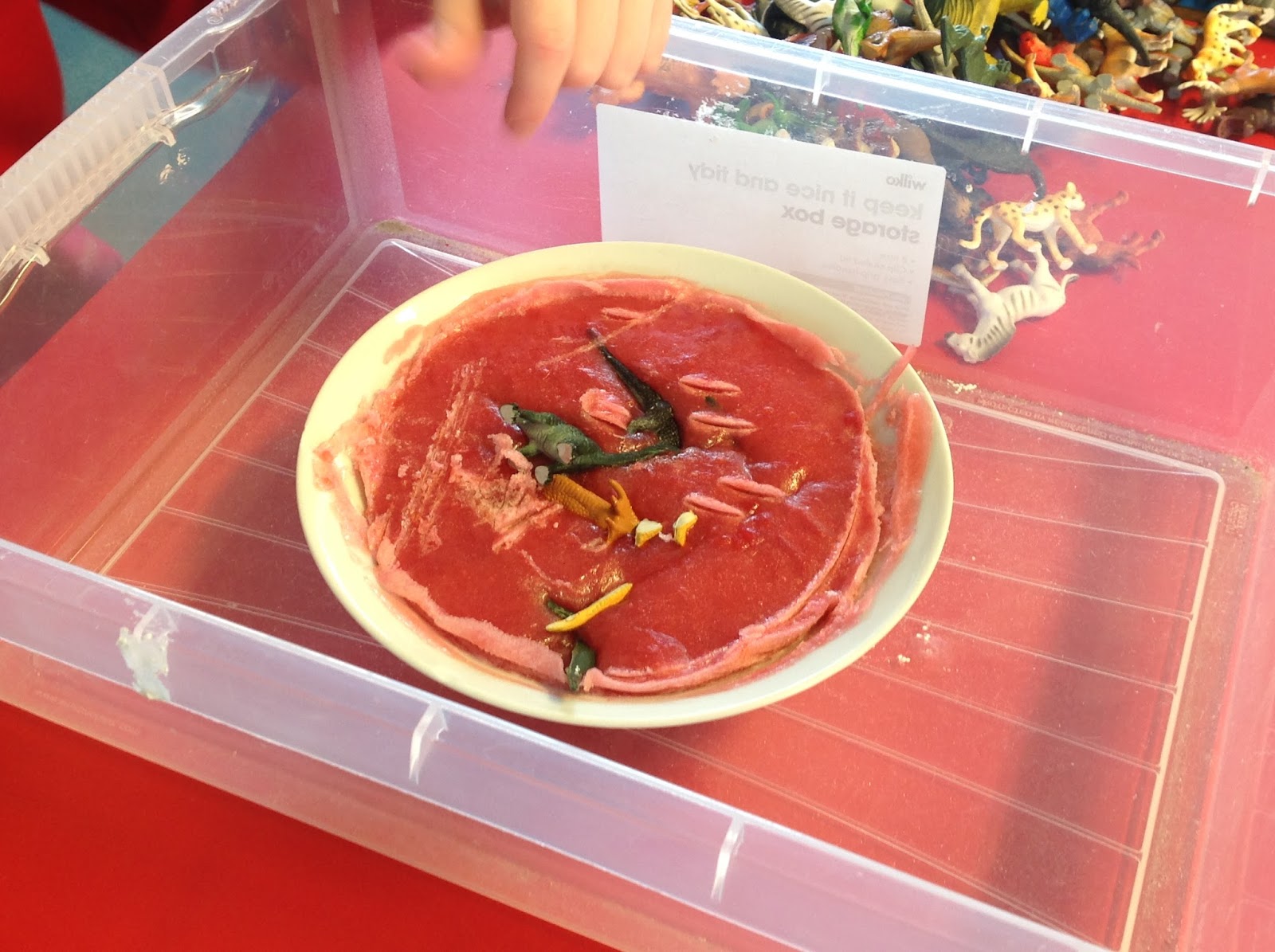 We put dinosaurs in apple juice in a bowl and then froze them overnight. The next day, we pulled them out of the freezer and put them onto the table for students to dig out. It also meant that the ice was edible for them – so we didn’t have to worry if they licked it or tried to eat it.