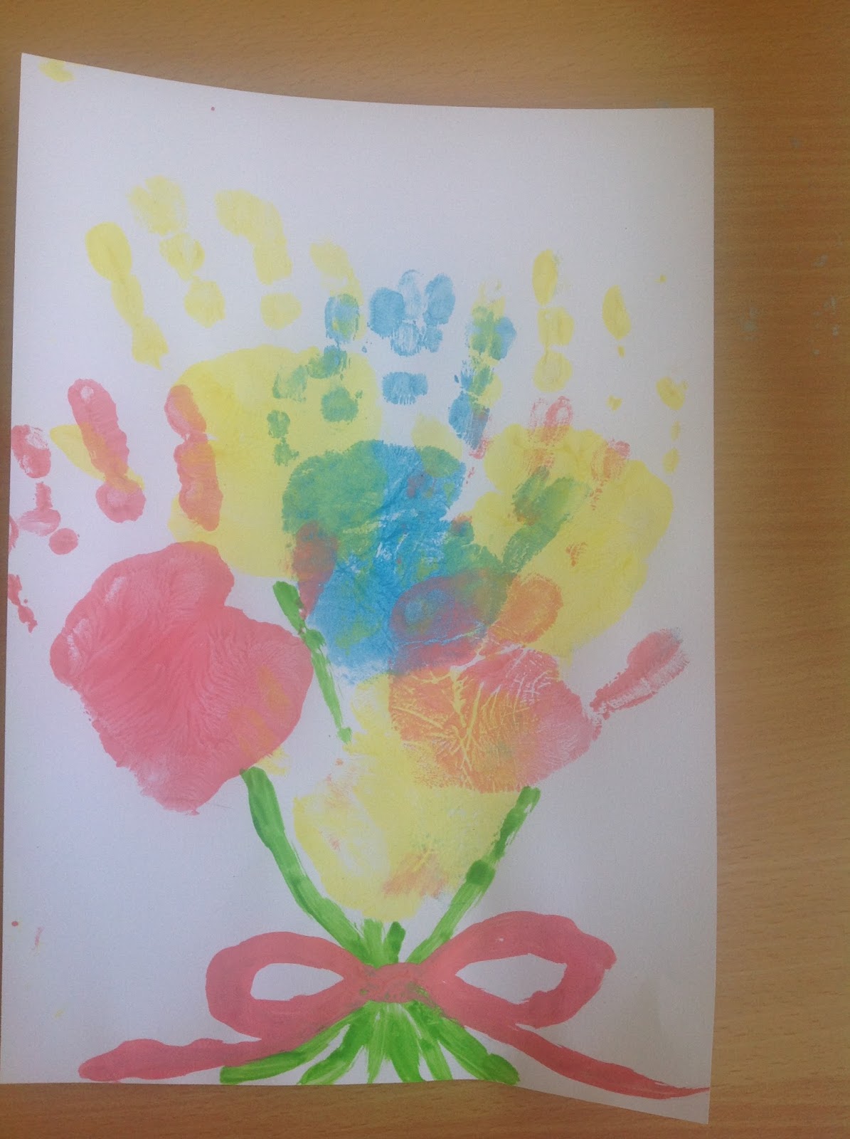 First, we painted the children’s hands in different colours. Then stamped them onto the paper to form a flower bouquet. We let the paint dry on each colour before printing the next colour hand. Once everything had dried, we added some green stems and a pink bow.