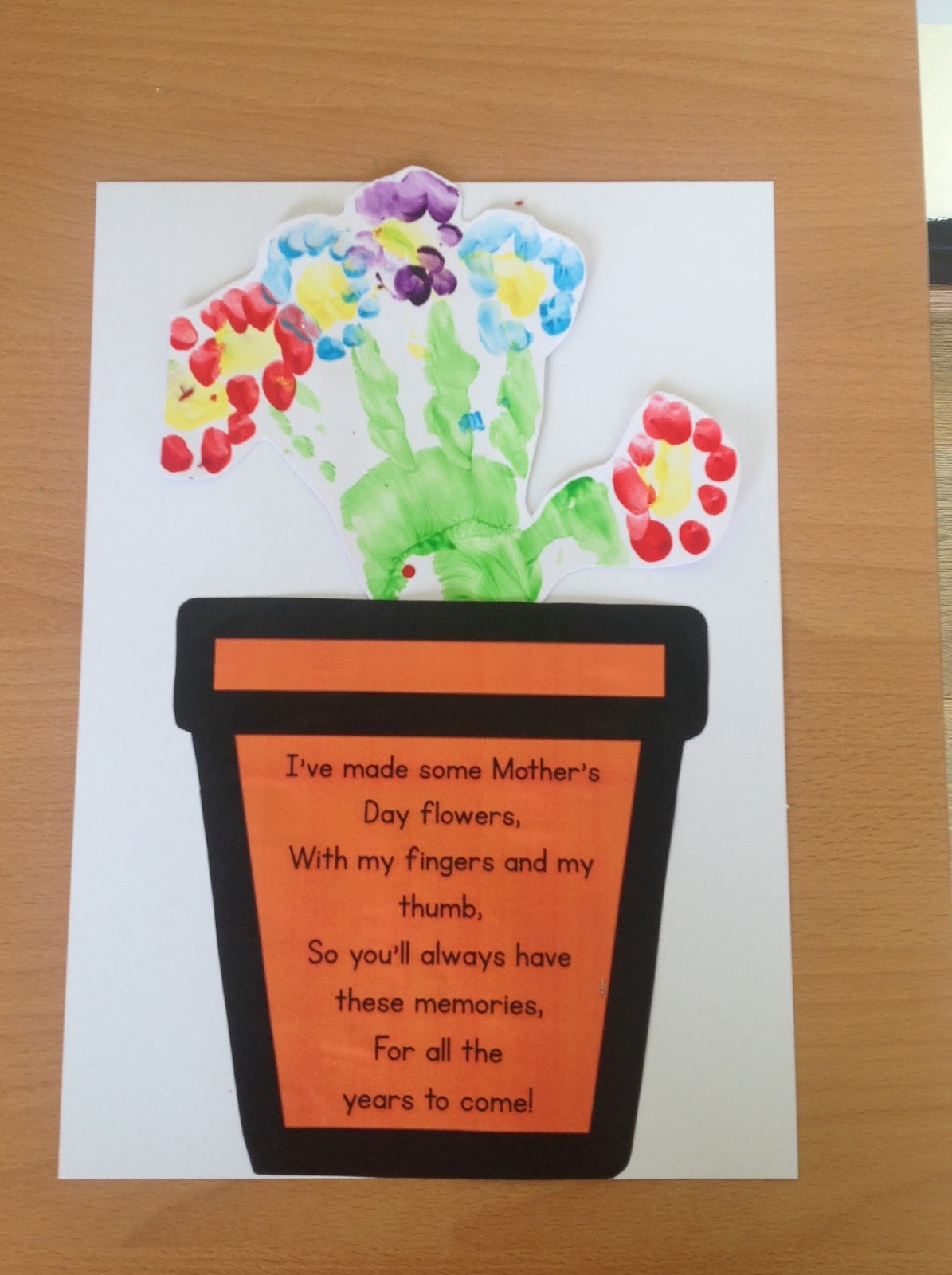 For this one, we had our students typing on the computer. We typed the poem together on the flower pots and printed them out. My students also hand printed green paint. Then we used our fingers to decorate the tips of our finger on the handprint to make flowers. When we glued it all together, it looked wonderful!