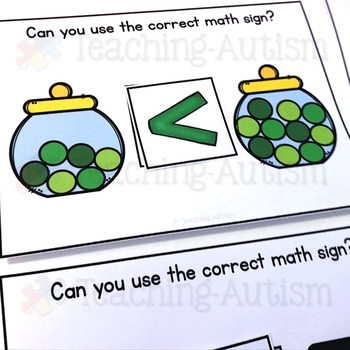 Each task card contains 2 images displaying a different amount i.e. gold coins in a pot, candy in a pot etc. There is a blank box in the middle of the 2 images on each task card. Students then use their math symbols to place into the middle of the task cards.