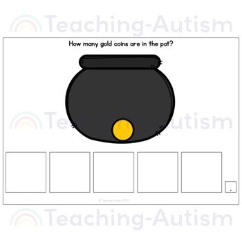 Students look at how many gold coins are in the pot. Then, find the matching symbols to make a sentence. I.e. ‘5/five coins in the pot.’