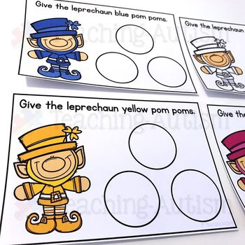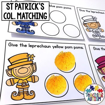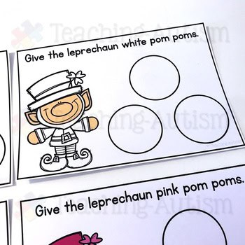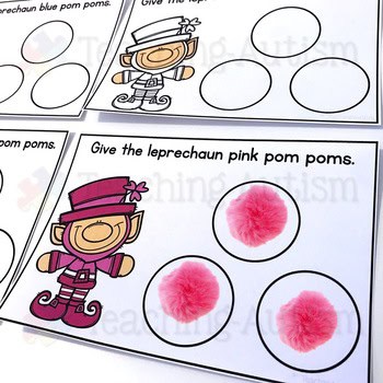 - Have the same color pom poms available for your students to match them to the correct color task card/leprechaun.