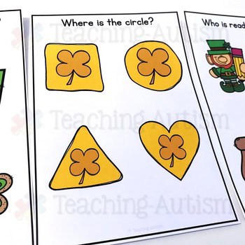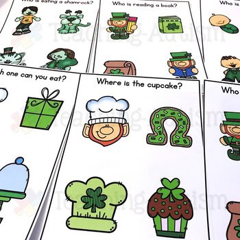 These wh question task cards are perfect to add some St Patrick’s fun into your speech therapy sessions. There are 18 different St Patrick’s Day themed task cards included in this pack. Each task card contains a wh- question on top and then 4 images underneath. Students need to answer the wh- question by pointing to the correct, corresponding image.